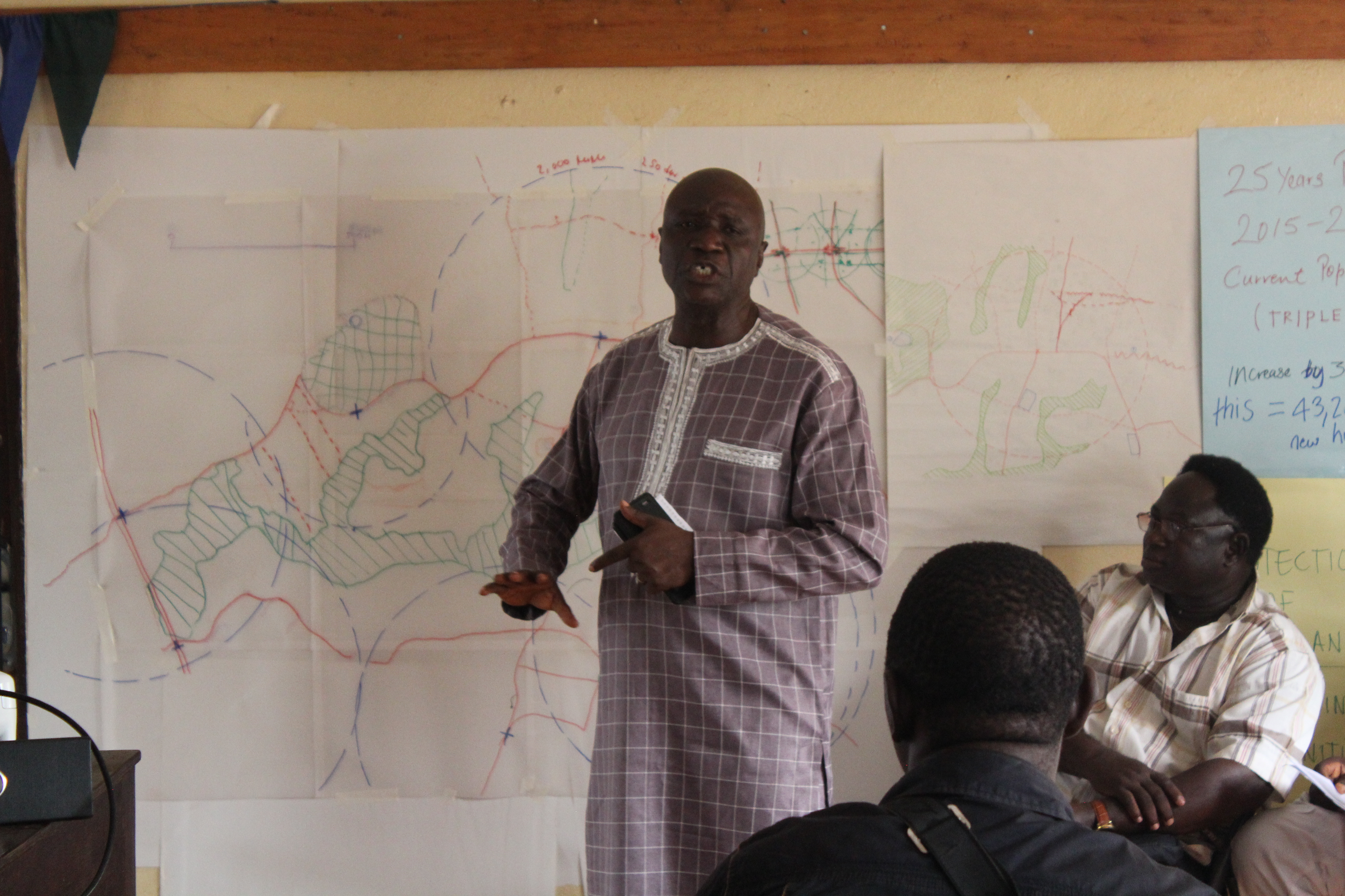The Bo City Council team were joined by Bo District Council members, Land Owning Families and Paramount Chiefs to undertake the Workshop. Constraints were initially faced as the team struggled to trace over maps printed at A4 (the largest available printer). Despite this, by the end of the day a growth area to the North of Bo was identified as being the best place to structure a new neighbourhood. The area is home to wetlands which are already being built on, so it was identified as an opportunity to act quickly to preserve the wetlands whilst making space for sustainable development and creating good transport links between the North and North-west highways.